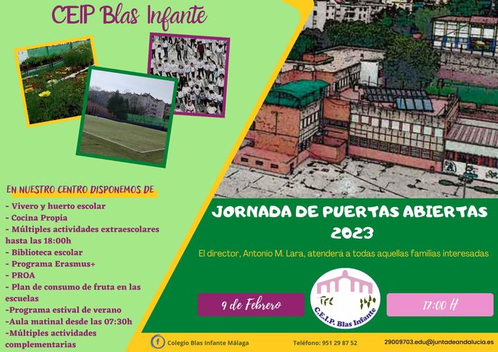 Jornada de puertas abiertas Publicación de la entrada:26/01/2023 Categoría de la entrada:Noticias El próximo día 9 de febrero a las 17:00, vamos a celebrar una jornada de puertas abiertas en nuestro Colegio. Todas las familias interesadas serán atendidas por su Director Antonio Lara. También podría gustarte Excursión a Granada 09/02/2023 Pasaje del terror CEIP Blas Infante 31/10/2024 Actuaciones día de Andalucía 2024 12/03/2024