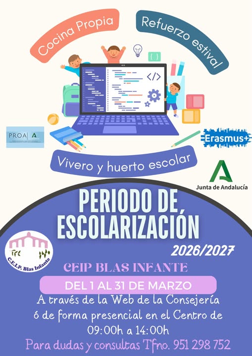 Desde el día 1 al 31 de marzo, se llevará a cabo el periodo de escolarización, a través de la Web de la Consejería ó de forma presencial en la secretaría del CEIP Blas Infante en horario lectivo de 9:00 a 14:00. Para cualquier duda o consulta puede contactar con el teléfono del Centro 951 298 752.